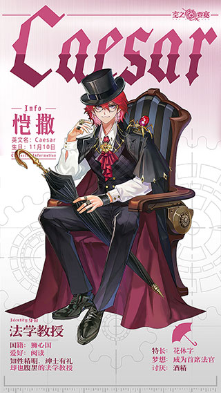 出身狮心国贵族博尔吉亚家族的法学教授,是家族中第一个选择法律领域的继承者。恺撒自幼接受贵族精英教育,面对各种情况都能应对自如。在他看来,任何事物没有绝对的对错,只有价值的高低。