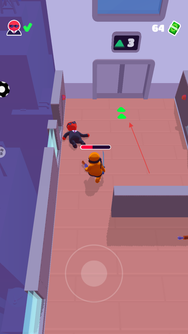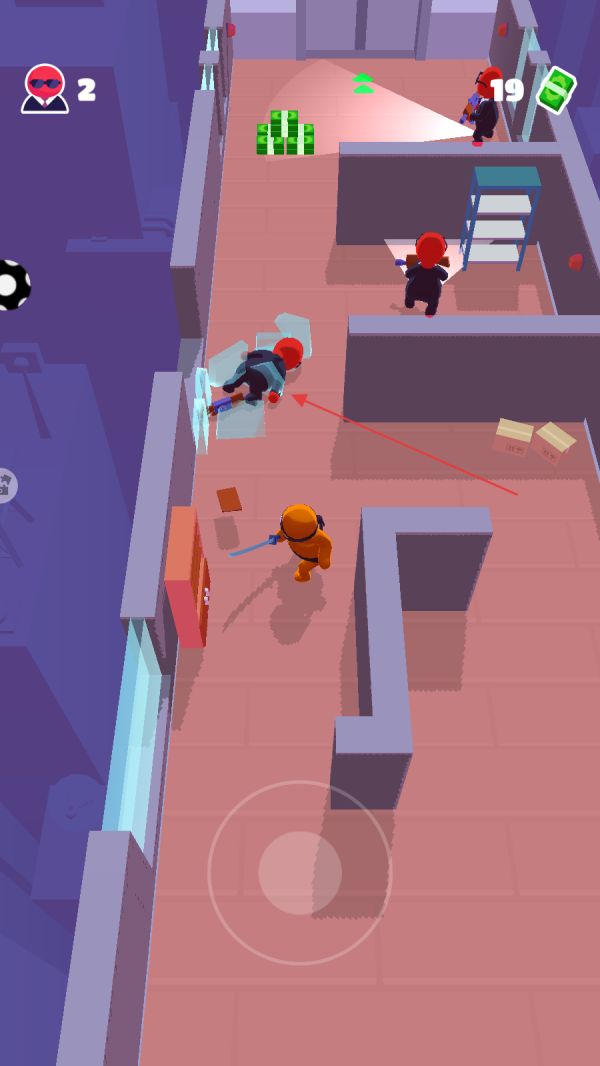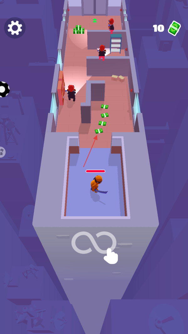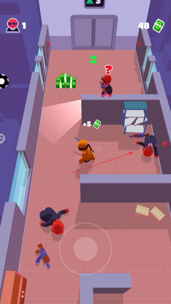 在游戏中,你需要操控橙色角色在通道中移动,同时要留意周围穿着红色衣服的敌人位置。利用场景中的障碍物来隐藏自己,逐步接近散落着绿色钞票的区域,为接下来的行动做好准备。