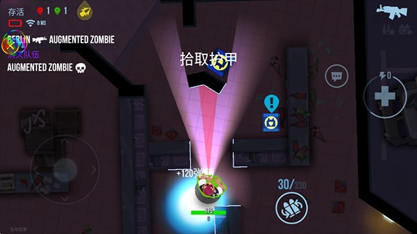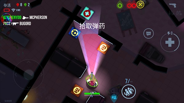 游戏采用俯视视角,玩家用左手摇杆控制角色移动,右手按键进行换弹、治疗等操作。操作简便,非常适合新手玩家。