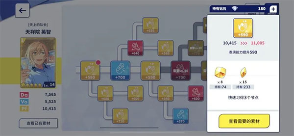 偶像之路:使用对应的道具或者钻石解锁格子,提高卡片的数值、技能、服装、才能绽放等。