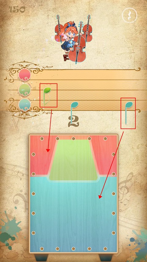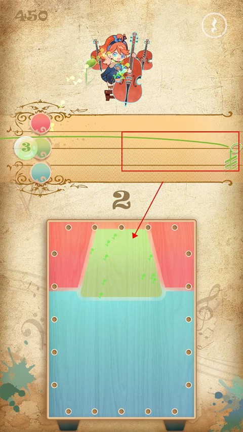 4、游戏的核心玩法是三色音符演奏,屏幕上方会出现音符,你需要点击下方相应颜色的按钮来收集音符,或者根据鼓点节奏击鼓。