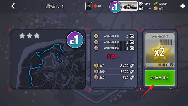 9、玩家需要驾驶警车不断撞击罪犯车辆,注意屏幕右上角的车辆损伤和油量,记得及时修复并加满。