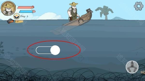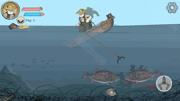 3、点击右下角钩子可以抛出鱼钩进行捕鱼,点击屏幕可以掷出鱼叉帮助捕获