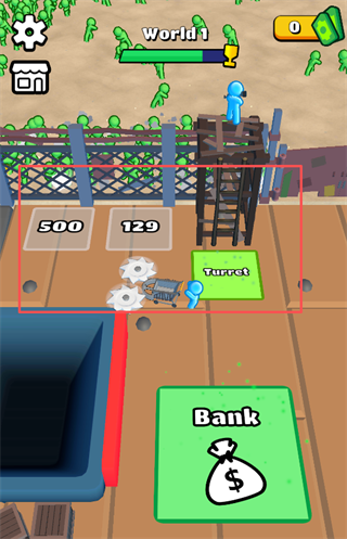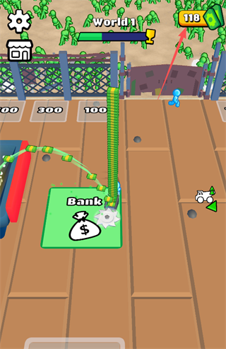 将收割僵尸获得的金钱存入【Bank】,积累的金钱可用于后续的装备升级、建筑建造等操作,右上角显示当前拥有的金钱数量。