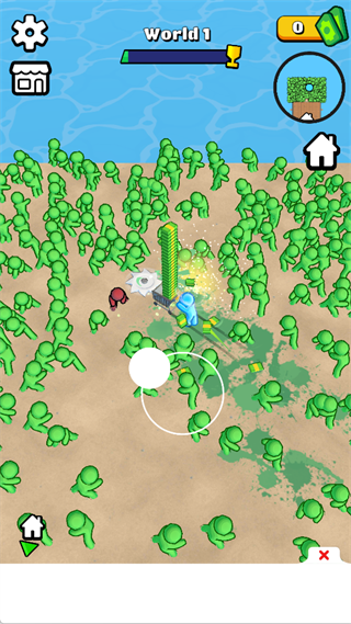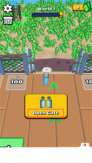 点击【Open Gate】按钮开启大门,进入布满绿色僵尸的战场,开启收割僵尸的战斗流程。