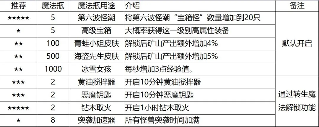 (2)突袭加速器:效果很好,可以瞬间开启所有突袭怪兽。但消耗魔法瓶速度过快,慎用。