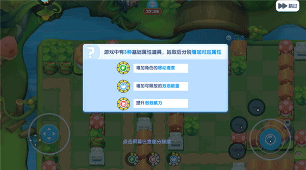 2、捡取水球精华后,系统会展示三种属性道具供你选择,这些道具将决定你的技能发展方向,要灵活选择适合当前战局的属性。