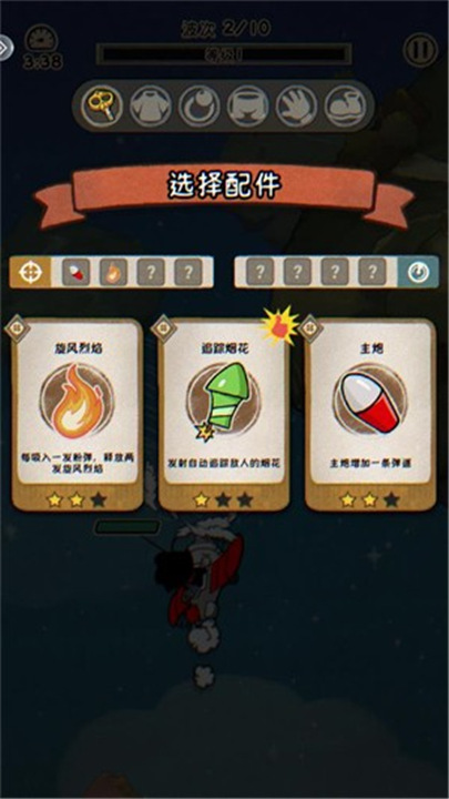 4、击败敌人可以增加经验值,当经验值达到上限时,可以从三个配件中选择一个来强化自己。