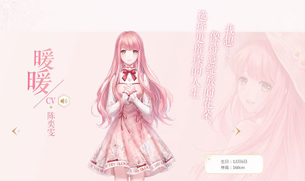 暖暖,本名苏暖,是本游戏的主角。她外形可爱,拥有一头粉色的卷发。暖暖与她的宠物大喵和一群朋友一起,开始了环游世界的冒险。她会经历各种冒险,收集材料并亲手制作精美的服饰。同时,她的审美和搭配能力也会接受各种挑战,只有搭配得当才能继续前行。