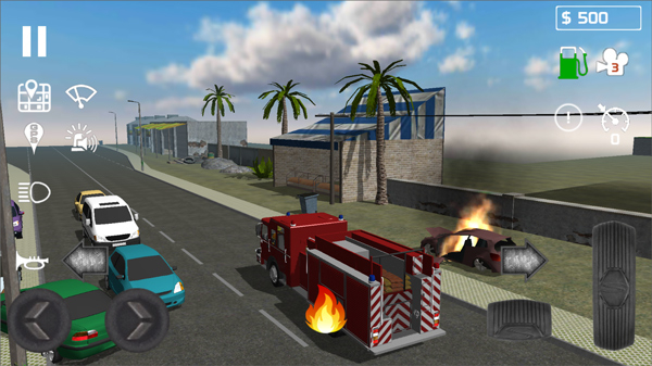1、进入游戏主界面后,检查消防车的油量和水量,调整好设置,点击方向盘图标开始你的任务。