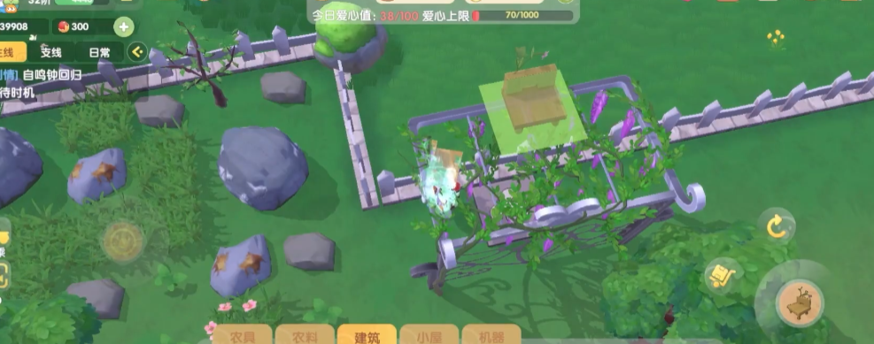 跨越围栏的操作可以分成三个简单的步骤。首先,在家园编辑模式中,把两块圆石板摆放在围栏的两侧,形成阶梯状;接着,在第二块石板的旁边,放置一个紫藤花架,并且要确保花架的方向指向邻居家;最后,在花架上方悬挂一把椅子,并进行交互以乘坐。完成这些步骤后,角色就会在空中,只需移动摇杆指向目标方向,就能轻松穿越围栏。需要注意的是,椅子只能面向左右方向摆放,如果正对着围栏,交互就无法成功。