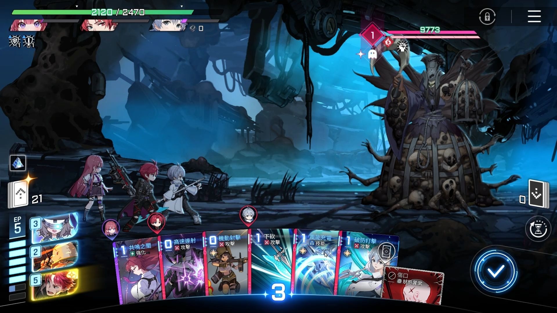 当队伍中有两名角色完成属性强化后,就可以开始全面进攻。在总攻期间,应集中使用高倍率单体伤害卡牌,最大化输出效率。在BOSS残血阶段,其攻击频率会上升,出手间隔缩短,这时前期预留的治疗卡将发挥关键作用。根据实际情况灵活使用治疗手段,及时提升生命值。同时可以配合具有斩杀效果的卡牌,在敌方血量低于阈值时触发额外爆发伤害,最终通过连续输出完成收割。
