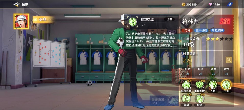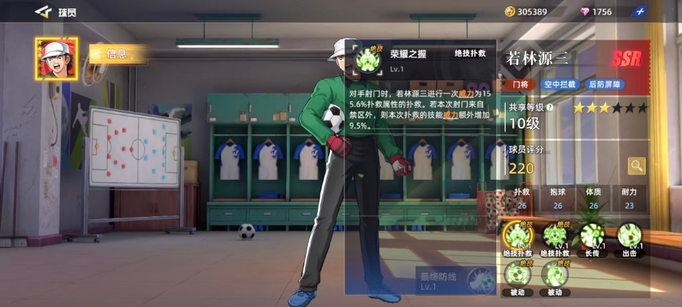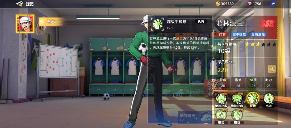 最后一个技能是“最终防线”,在比赛开始时,若林源三可以凭借这个技能获得3层【最终防线】,并在每次扑救成功后获得1层【最终防线】。当叠加到5层时,效果最强。但是,一旦被进球,所有层数都会消失。这个技能的效果是为若林源三增加16.6%的扑救属性和16.6%的反应属性增益。