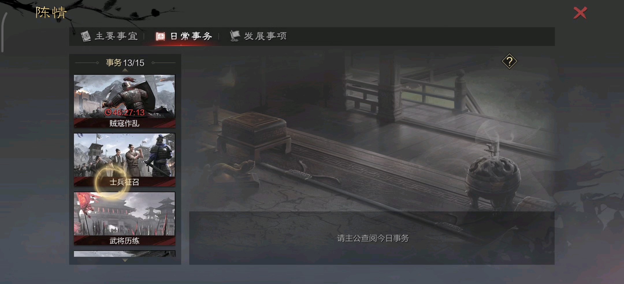 不同类型的陈情事件对武将的要求也不一样。有些事件可能只需要武将达到一定等级,有些则要求武将具备特定的兵种或特性。这就要求玩家在培养武将时要注意多样性,不能只专注于少数几个主力武将。有些特殊的陈情事件会要求玩家委派具有特定能力的武将,比如某些擅长内政的武将或具有特殊技能的武将。这就要求玩家在游戏中要注重武将的全面培养,不能仅仅关注战斗型武将的成长。委派合适的武将不仅能够提高事件完成的效率,有时候还会触发额外的奖励内容。对于刚开始接触这个系统的玩家,建议优先完成那些不需要特殊条件就能完成的简单陈情,这样可以快速积累初期资源。