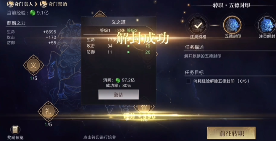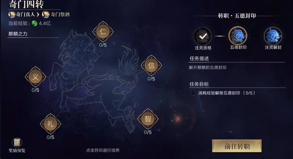 四转是角色成长的重大里程碑,要求玩家达到140级,并完成“五德封印”的一系列任务。任务共分为五个阶段,每个阶段需要投入19.9亿到63.4亿不等的经验值,总共大约需要解封25次。经验主要可以通过日常副本、野外打怪和活动任务来积累,建议提前准备双倍经验道具以提高效率。在转职过程中,玩家还需关注角色装备的评分是否达标,以免因战斗力不足而使任务难以推进。