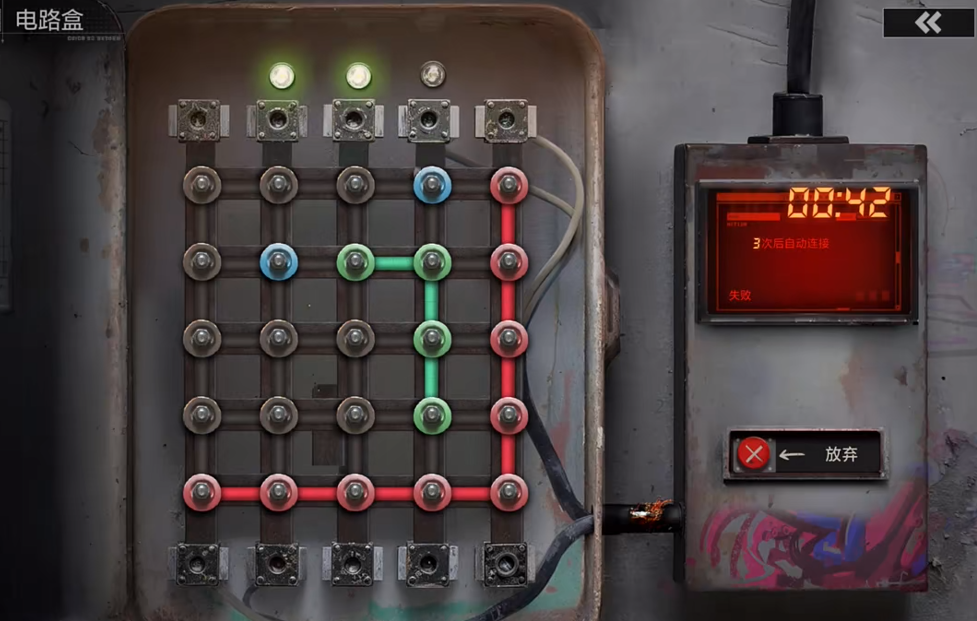 成功开启闸门后,门会打开,玩家进入房子,面前是一堆箱子及物资。此时,玩家应直接上楼至二楼,在那里找到电路盒。为了顺利通关,玩家需要玩一个简单的小游戏,但需注意颜色搭配。将相同颜色的物品连接起来,成功解谜后,将获得绿卡。