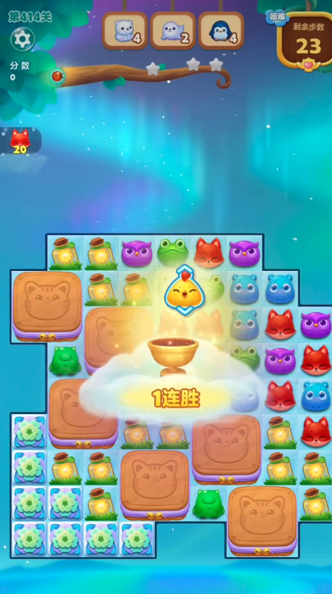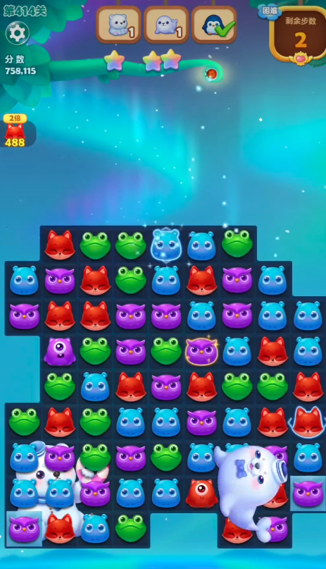 414关的难点不在于步数而在于布局。金豆荚藏在了一大片厚厚的雪块中间,这些绿色的雪花非常顽固,需要消除好几次才能彻底清理掉,而且雪块主要集中在棋盘的下方和中间区域,把路堵得比较严实。如果你一上来就急着到处乱消,步数很容易就不够用了。成功过关...