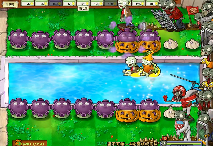 双发射手和火炬树桩的搭配非常实用,将双发射手放在火炬树桩后面可以大大提高攻击力,能够迅速清理普通僵尸甚至铁桶僵尸。高坚果是这个关卡不可或缺的防御植物,能有效阻挡僵尸的前进,为你争取更多输出时间。在水域区域,可以考虑摆放杨桃来形成交叉火力,或者选择香蒲来应对潜水僵尸的威胁。记住,每波结束后系统会奖励250阳光,要 及时用来填补防线上的漏洞。