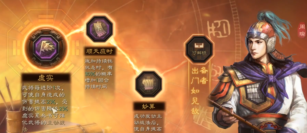 周瑜的兵书搭配方案是“攻其不备”、“将威”和“占卜”。其中,“攻其不备”的效果是针对敌军兵力最强的单位,能提高对其造成的伤害。周瑜的“神火计”是针对敌军全体的,有了这个兵书,就能重点攻击对面血量最厚、最难对付的单位,放大我们的输出优势,非常适合周瑜这种群体攻击的定位。“将威”则简单粗暴地增加暴击概率,智谋伤害也是可以暴击的,这样就能让周瑜的伤害有机会再上一个台阶,打出意想不到的爆发效果。最后,“占卜”非常关键,它能给周瑜提供回合外的减伤效果,要知道周瑜的速度不算快,有时候还没轮到自己出手就可能被对方打一套,这个减伤能很好地提升他的生存能力,让他站得更稳。通常配合这套兵书,推荐全智力加点,把输出的潜力发挥到极致。