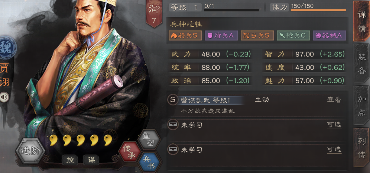 接下来是队伍的动力和控制核心贾诩。贾诩的自带战法神机莫测是控制敌人的关键技能,发动率较高,是队伍控制链的核心。贾诩的兵书选择取决于他携带的战法,主要有两个方向。如果他携带了兵无常势这种依赖普通攻击触发的谋略战法,那么推荐选择作战系的兵书,点出奇正相生以增加连击概率,与兵无常势的攻守兼备特性非常契合;文韬和执锐则能直接提升谋略伤害,增强贾诩的输出能力。如果贾诩没有携带兵无常势,选择虚实系的兵书也是不错的选择,如以治击乱,对处于混乱、技穷等控制状态的敌人造成更多伤害,与贾诩的混乱效果相得益彰;鬼谋和将威则能提升主动战法伤害和获得奇谋(暴击)的概率,使他的输出和控制更具威胁。