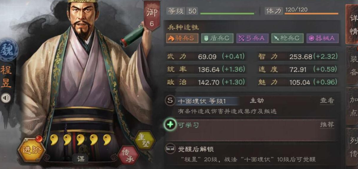 最后是队伍的绝对输出核心程昱。程昱的十面埋伏可以对处于负面状态的敌人造成真实伤害,并附带禁疗效果,非常强势。程昱的兵书选择相对固定,强烈推荐选择虚实系的兵书。第一层首选以治击乱,与贾诩类似,对处于混乱状态的敌人增伤,考虑到队伍中已有贾诩,这个兵书的收益非常高。第二层点鬼谋,同样增加主动战法伤害,直接提升十面埋伏的伤害。第三层点将威,提升奇谋概率,以期暴击,有时能造成惊人的伤害。通过这套兵书,可以最大化程昱的真实伤害,让他成为击败对手的利器。