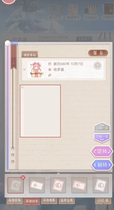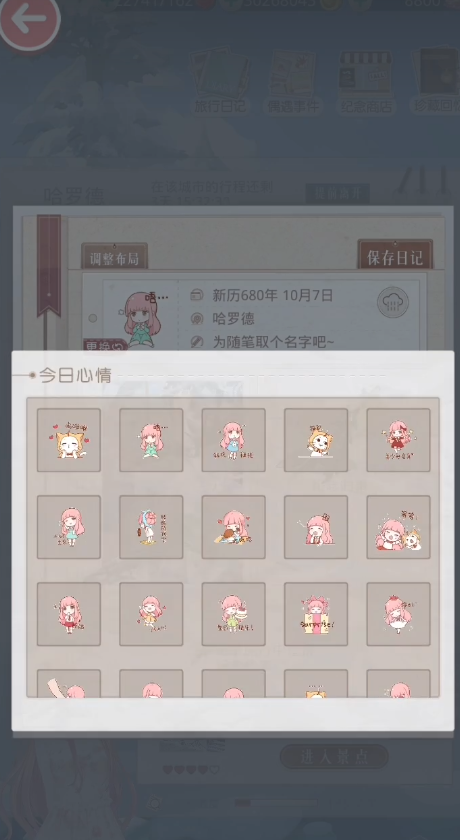 挑选好你想要的贴纸后,点击右上角的保存按钮就能成功应用。这些贴纸的来历很有趣,在世界巡游中,你只需点击游戏主界面右上角的热气球,选择你想要去的国家,就可以开始你的巡游。在游览各个景点时拍照留念,有时会触发特殊事件,成功后还会得到纪念贴纸,这些贴纸正是用来装饰旅行日记的完美选择。