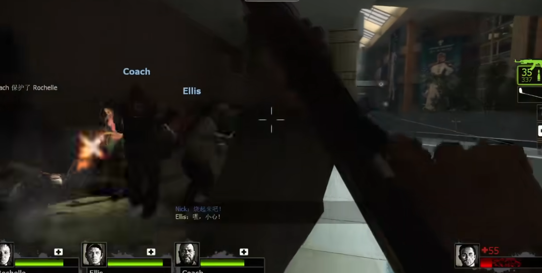 穿过火场到达大厅,必须清理所有感染者才能通过安全门。大厅战斗结束后,进入安全门,酒店部分的任务就完成了。之后将进入街道区域。街道上视野开阔,但危险重重,要善于利用车辆和路障作为掩护,同时密切注意屋顶或角落可能潜藏的特殊感染者。例如,hunters和smokers喜欢在高位或角落伏击,一旦队友被抓住,要立刻救援;而boomer则要尽量远离射杀,以免它的呕吐物吸引更多普通感染者。