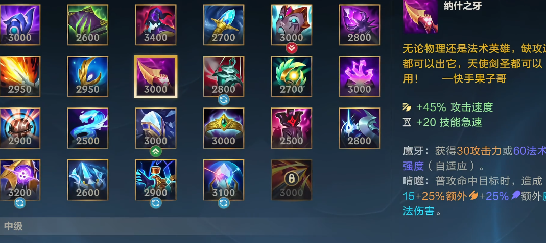 走法术输出路线的凯尔则首选科技枪,这件装备附带的吸血和减速效果非常适合天使的线上消耗。纳什之牙作为核心装备之一,为以普攻为主要输出手段的凯尔提供了必要的攻击速度和法术强度。随后补充帽子可以显著提升凯尔的法术强度,增加技能和普攻的魔法伤害输出。当游戏进入中后期,敌方开始堆叠魔法抗性时,法穿棒成为必备选择,它能有效应对敌方提升的魔法抗性。最后选择巫妖之祸可以进一步增强凯尔的普攻伤害输出能力,这套装备组合能让凯尔在团战中发挥强大的法术输出能力。