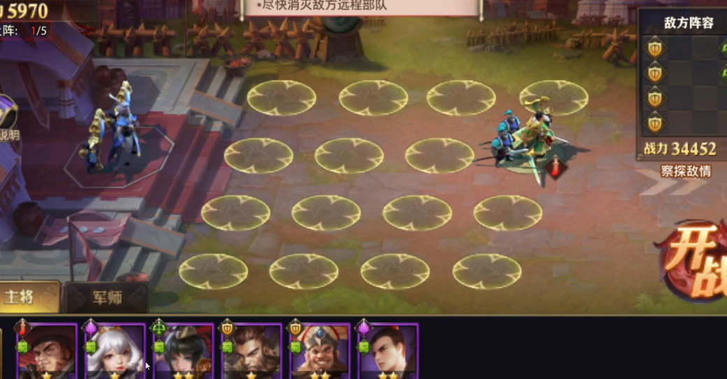 常规的布阵方式是将孟获和兀突骨这两个防御型武将放在最前方,第一行和第二行,以承受敌人的主要攻击。接下来,将刘备、黄舞蝶和黄月英这三位输出和辅助型武将安排在阵型的后方,也就是盾兵的后面。这样做的目的是保护那些较为脆弱的远程和辅助单位,让他们能在安全的位置进行攻击和治疗。两个前排的位置可以根据实际情况适当调整,但核心原则是确保后排有一个安全的输出环境。