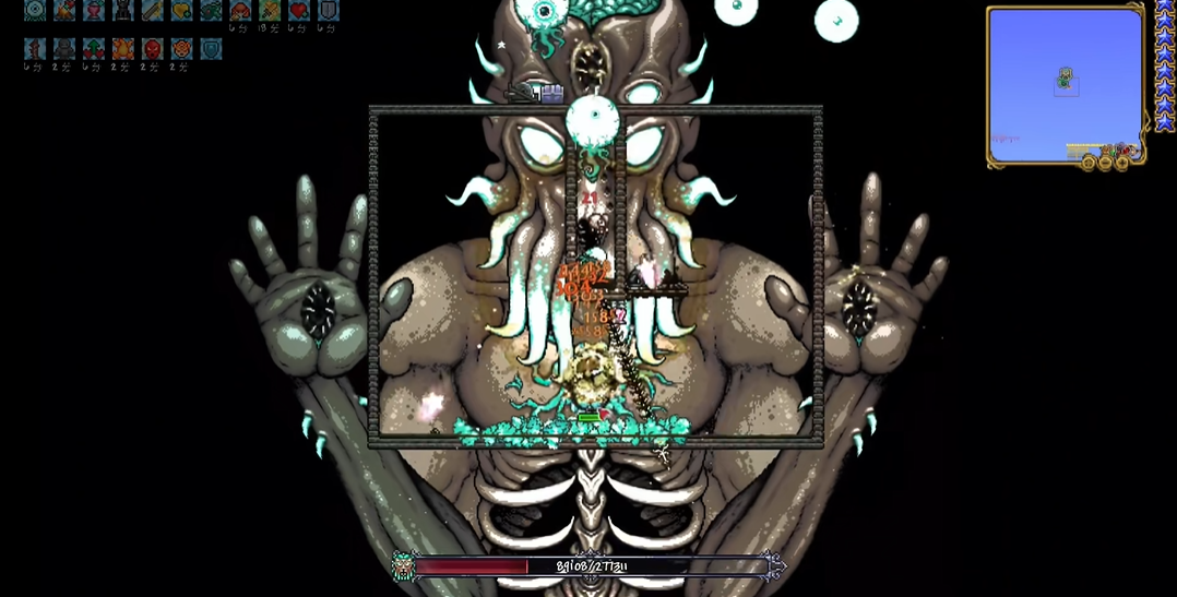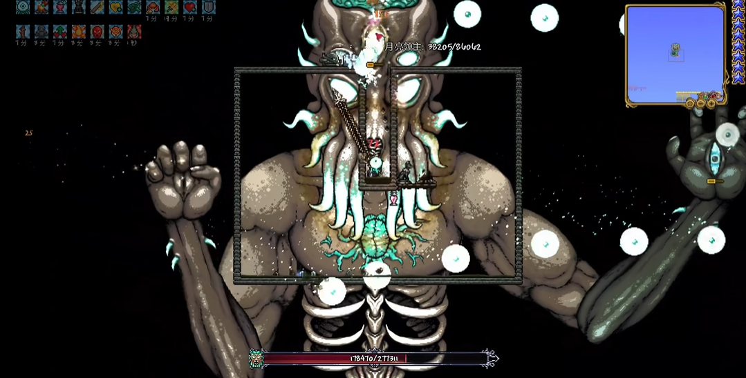 遇到这位最终BOSS之前,你需要完成月亮事件,也就是击败拜月教邪教徒后出现的四个天界柱。这四个柱子分别是日耀、星旋、星云和星尘,每个柱子周围都有一大群特有的怪物,你必须先清理掉一定数量的怪物才能打破柱子的护盾,然后才能攻击柱子本身。当四个天界柱全部被打败,屏幕上就会出现月亮末日慢慢逼近的提示,一分钟后月亮领主就会降临。如果你想要反复挑战,也可以用四种天界柱掉落的碎片各20个合成一个天界符来直接召唤。月亮领主出现时,你会看到它有两只手臂和一个头,每个部位上都有一只眼睛,总共三只。这些眼睛会轮流睁开闭上,只有睁开时才能对它们造成伤害。第一阶段它的攻击方式很多,手上的眼睛会发射跟踪飞弹并召唤幻影眼撞你,头上的眼睛则会释放一道威力巨大的激光横扫屏幕,这个激光非常致命,但好消息是它和大部分攻击一样,无法穿透实心方块。