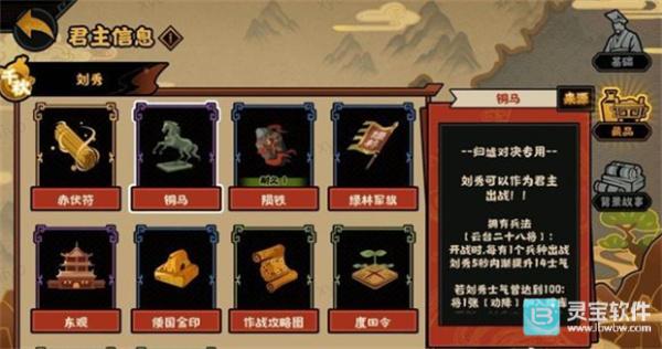 接下来是紫色收藏品——铜马,专门用于归墟对决,刘秀可以作为君主参与战斗。这个就不多说了,等大家实际操作后,自然会有体会。