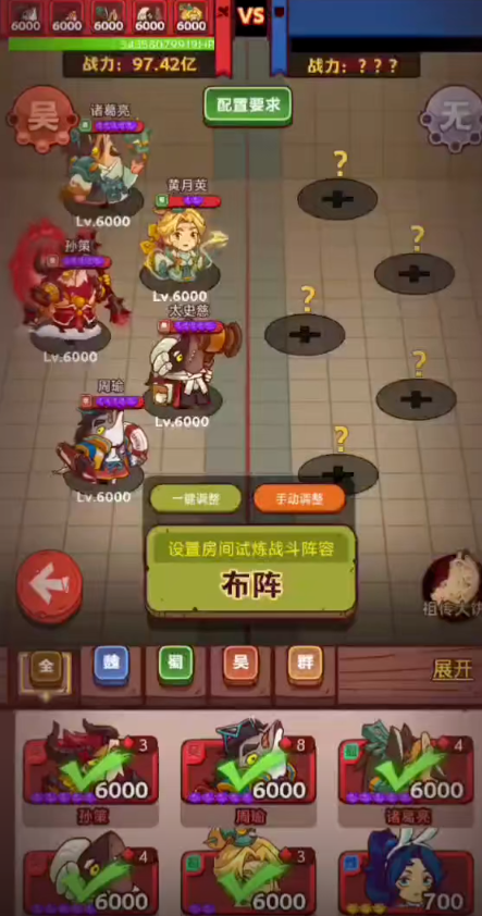 此时的阵容可能会是吕布、黄月英、诸葛亮、太史慈,再加上一个魏延或曹仁。黄月英和诸葛亮的羁绊可以保证生存,曹仁可以提供护盾,太史慈继续增加伤害,吕布依然是主要的输出。面对像咸王这样血量极高的BOSS,一些无视防御的伤害效果特别有效,比如周瑜、孙策造成的灼烧效果。