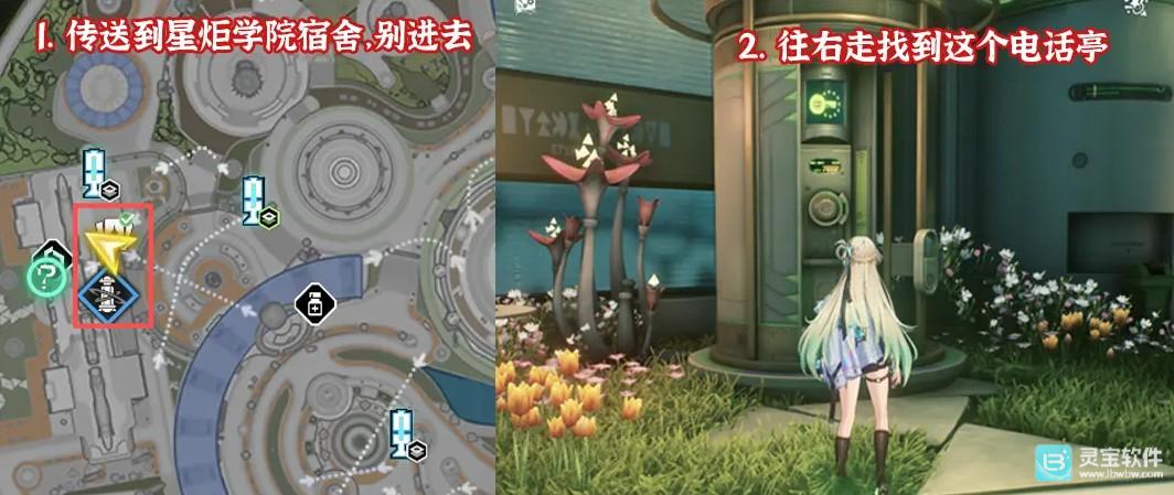 传送到星炬学园宿舍,往右走找到电话亭。