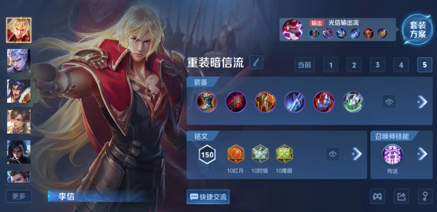 在四级之前,李信相对较弱,应以稳健的清理兵线发育为主,尽量避免与强势的边路英雄正面冲突。变身成为暗信后,你将迎来第一个强势期,此时拥有高攻速和加速回血技能,可以主动寻找机会,利用一技能加速接近对手,接着使用二技能减速和普通攻击进行换血,利用一技能的霸体和回血效果,往往能取得优势。中期核心装备末世制作完成后,暗信的战斗力将发生质的飞跃,此时任务就是快速清理兵线,然后利用一技能的高机动性去偷敌方野区,或者支援其他线路,对敌方兵线和野区同时施加压力,打乱他们的节奏。