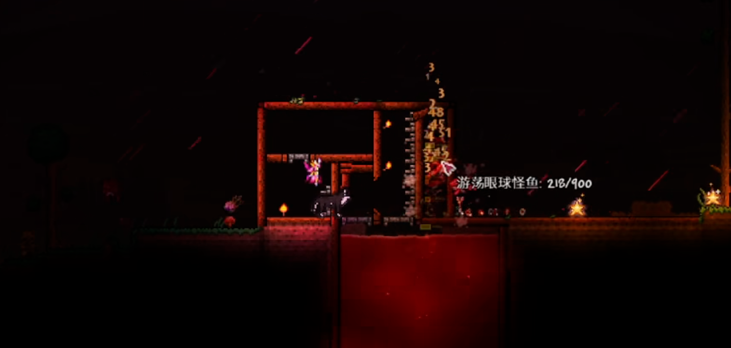 建议玩家提前准备一个封闭的避难所,比如用土块或搭建平台代替门,或者只留一个小洞用于安全输出。使用长矛或弓箭等远程武器能有效降低被近身攻击的风险。如果装备还没准备好,最好是躲到地底,避免敌怪密集生成。准备篝火和生命药水也能大大提高生存率,因为血月期间在地面活动非常危险。