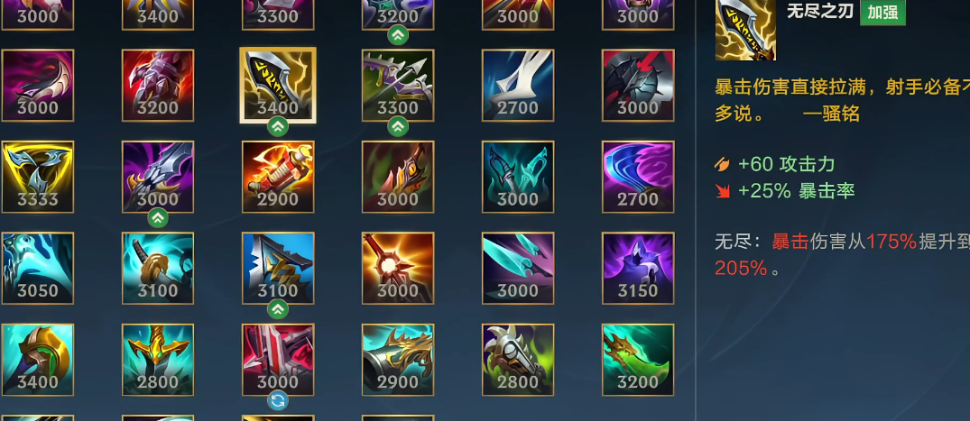当你决定购买无尽之刃时,意味着你已经完成了对线发育,准备在中期团战中掌控战局。这件装备本身并不提供生存能力,因此对你的走位和输出时机要求很高。你通常会先购买一些提供续航或攻速的装备,比如太阳刀或电刀,然后再购买无尽之刃,这样既能保证你的持续作战能力,又能让你在伤害上实现质的飞跃。没有暴击率支持的无尽之刃效果会大打折扣,所以最好在拥有一定的暴击几率后再购买,让你的暴击伤害得到最大化。