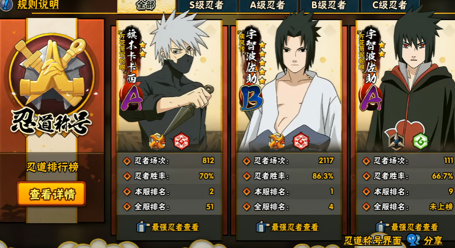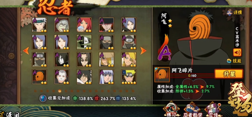 新手玩家刚进入游戏的时候,系统会送一个A级忍者阿飞,这个忍者在当前版本算是A忍里比较靠前的,前期通过任务和活动就能解锁技能,对于快速提升前期的战斗实力帮助很大,算是开局就能上手的一个稳妥选择。而一些讲究稳扎稳打风格的玩家,可能更偏爱我爱罗啊...