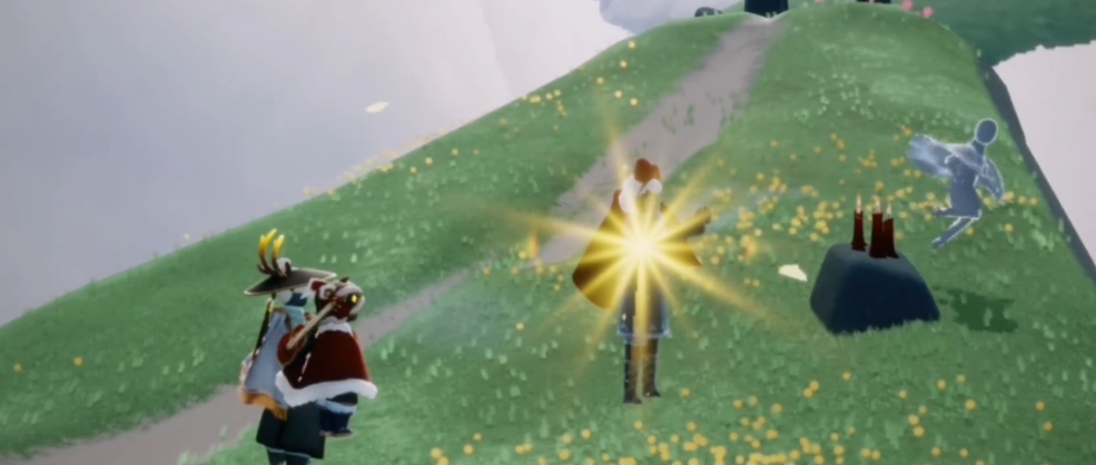 找到祖先后,接下来的任务就是点亮她并完成追忆。当你飞上那座圆形小山丘时,就能看到祖先的灵魂。靠近她并点燃心火,就可以开始追忆任务。这位祖先的追忆过程有些特别,不是跟着光点走,而是需要在附近搜集零散的记忆碎片。这些碎片会以橙色星星的形态出现在山丘周围,你得飞过去触碰它们,收集完毕后,就能解锁祖先并学会一级的撒花动作,这个动作非常有趣,能释放出美丽的礼花效果。完成追忆后,别忘了去云野终点的神庙,把这位祖先送回天际,这样你才能在遇境她的石像那里永久兑换物品。