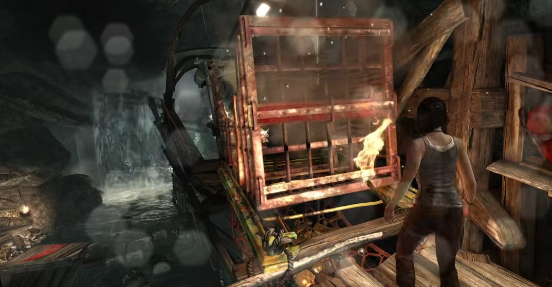 进入水帘洞穴后,劳拉需要再次运用求生本能来识别关键物品,烧掉拴住水闸的两根木棒,使水闸落下,拦截流经的货物。然后点燃这些货物,走到楼梯上方,调整悬挂平台的位置,利用重力将燃烧的货物送入专用通道。注意,铁箱上方可能会有水流淋下,可能会熄灭火焰,玩家需要把握时机点燃货物。最终,通过爆炸炸开前方的障碍,这一阶段需要玩家结合环境观察和工具使用。
