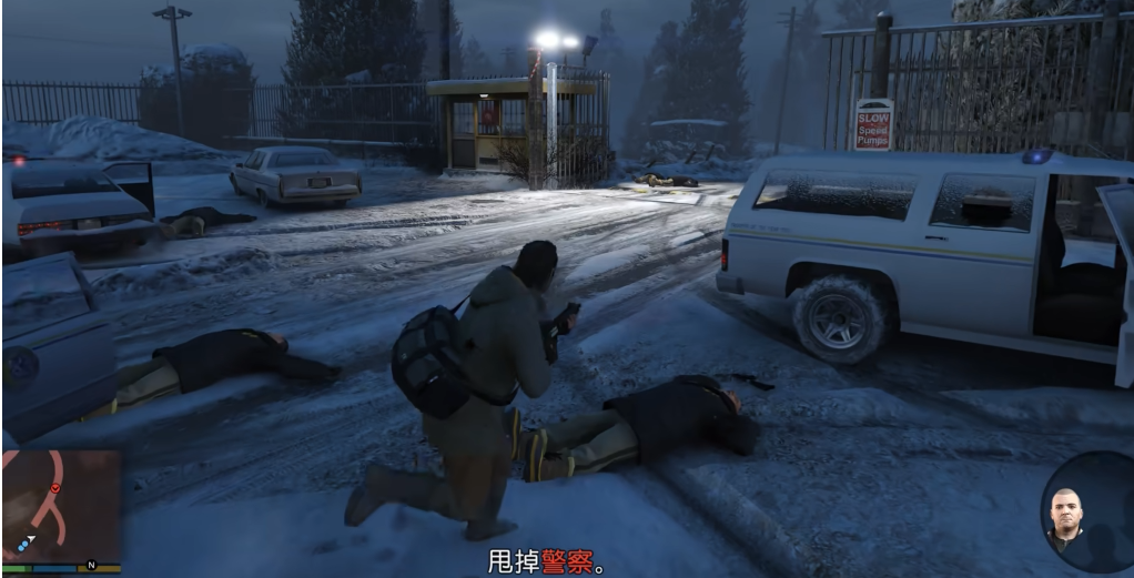 三人移动到银行后门,找到非正对出口的位置按RB键进入掩体,小布会放置炸弹炸开后门,老崔操作卷闸门出去。在停车场遇到警察围堵时,先以石柱为掩体射击,清理掉前线的警察后,逐步推进到银行大院大门。进入农场后,公路上会有更多警车冲来,继续用警车做掩体前进,最终到达骑兵大道,登上吉普车开始驾车逃亡。