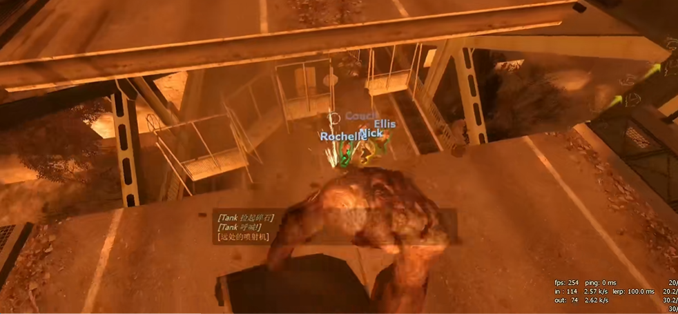 对付Tank,咱们得讲究移动技巧和时机。要是躲不开它的近身攻击,又没有后方的障碍物或悬崖,那可以试试跳起来,利用被击飞的效应来拉开距离,同时争取时间恢复行动能力。对于它远程投掷的石头,咱们要小心它的预测机制,通过快速转向或侧身来躲避;而且可以用武器把石头打碎,减少伤害。当Tank着火跑得快了,但火焰的伤害不能叠加,所以不停地用火瓶是不管用的,而用连发枪集中射击能减缓它的速度,但多把枪一起打也不会让减速效果叠加。还要注意别站在Tank能推动的物体上,以防被间接攻击到。
