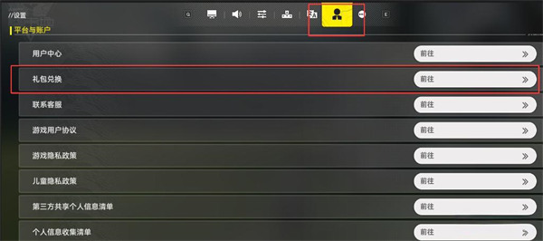 4、在设置界面中,找到并点击倒数第二个选项“平台与账户-礼包兑换”;