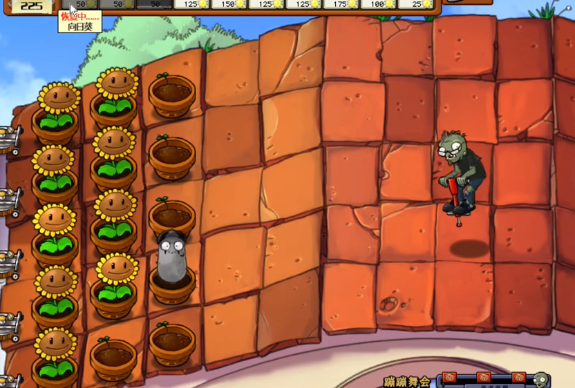 要想在蹦蹦舞会中取得胜利,关键是要挑选合适的植物,并且做好初始布局。必要的植物有向日葵来制造阳光、窝瓜来快速消灭早期的僵尸、磁力菇来吸走跳跳僵尸的弹跳杆、高坚果来直接挡住跳跃的路,还有西瓜投手来造成范围伤害。开始的时候,应该先种两排向日葵来快速积累阳光,在最左边留一个空位来放窝瓜,这样可以缩短它的冷却时间。第一只跳跳僵尸通常会在游戏开始后大约55秒出现,要马上在它所在的那一行的最后一格种上窝瓜来消灭它,第二只僵尸也可以用同样的方法处理。