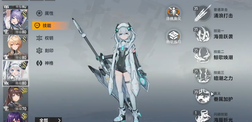 她的技能系统设计得相当巧妙,她可以通过积累和消耗印记来提升治疗和输出的效果。她的普通攻击“涌浪打击”分为五段,命中一定次数后就能积累印记;一技能“海兽跃袭”可以向前挥出海浪并召唤海兽眷属,获得“逆潮”印记,提升治疗力和技能伤害;二技能“鲸歌唤潮”可以从自身为中心召唤海兽,获得“鲸歌”印记,提高暴击伤害并为团队提供免伤效果。三技能“暗潮之力”在印记不满时积累印记,满时则转化为“深海愈疗”,消耗所有印记和标记,造成伤害并附带治疗或减益。这种机制要求玩家合理运用技能顺序,以最大化印记的增益和团队生存能力。