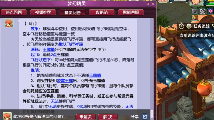 拥有了飞行祥瑞之后,让它起飞的关键道具是玉露。每次点击起飞按钮,都会消耗2点玉露值。飞行状态下,每30秒会持续消耗6点玉露值。但战斗状态下或地面骑乘时,不会消耗玉露。补充玉露也很方便,游戏内有雨露这种道具,一个雨露可以补充500点玉露值。关于飞行时的消耗策略,有一个小技巧:在连续进行抓鬼等需要频繁移动的任务时,不建议每场战斗前都特意降落,因为每次重新起飞都会额外消耗2点玉露,且起飞降落有动画会耽误时间。正确的做法是在任务路途中保持飞行状态,直接飞入战斗,这样可以节省总体时间和玉露消耗。