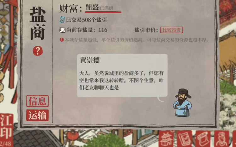 盐商分为三个级别,每个级别提供不同的运输服务。一级盐商负责运送基本资源,二级盐商可运输工人,增加劳动力,三级盐商能购买特殊建筑。随着盐引交易次数增加,盐商的财富级别会提升,解锁更多功能,这个过程需要玩家不断积累盐引数量。