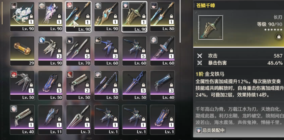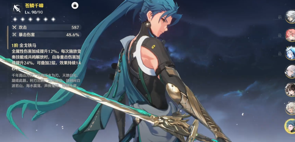 苍鳞千嶂是卡卡罗的最佳武器,它不仅提供丰厚的暴击伤害加成,而且在释放大招后显著提高重击伤害,有效填补了变身期间的输出空白。这把武器还能减轻声骸配置的负担,让卡卡罗在持续的战斗中保持高伤害输出,特别适合追求高爆发力的玩家。