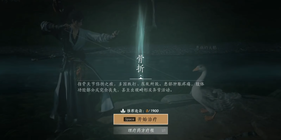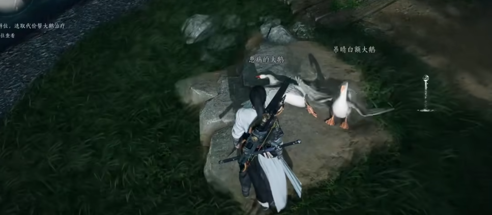 这个任务是获取鹅蛋的必要步骤。完成了任务,玩家就能得到鹅蛋作为奖励。鹅蛋会放在玩家的背包里,找到它后选择孵化,就能孵化出一只大鹅。孵化出来的大鹅会暂时跟着玩家走。治疗大鹅的任务有不同的结果,玩家可以选择不同的鹅蛋。有一种特别的玩法,就是在治疗界面用听风辩位技能后直接退出,这样大鹅就会变成丧心病狂大鹅,再用太极奇术把它扔进水里,就能立刻得到丧心鹅蛋和两个成就:鹅命托佛和嫉‘鹅’如仇。
