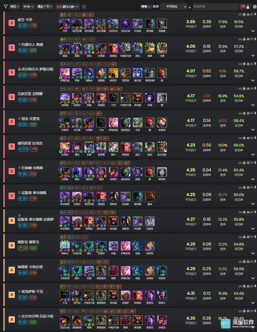 这是云顶热补丁后,大数据网站metatft发布的梯度排名,大家可以参考一下。发条不建议碰,龙王如果运气好再玩。目前上分推荐:根据前期抽卡情况,无脑玩艾欧/虚空/德玛!