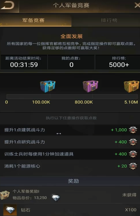 活动里有许多不同的任务类型,比如击败士兵、收集资源、占领目标等。完成这些任务可以获得积分,积分越高,你就能获得越多的奖励宝箱。所有需要达到积分的宝箱奖励都需要你在活动页面手动领取,如果错过了,这些奖励会在活动结束后通过游戏邮件发送给你。除了个人积分奖励,你还会和其他玩家竞争全服的排名,争取更好的排名奖励。